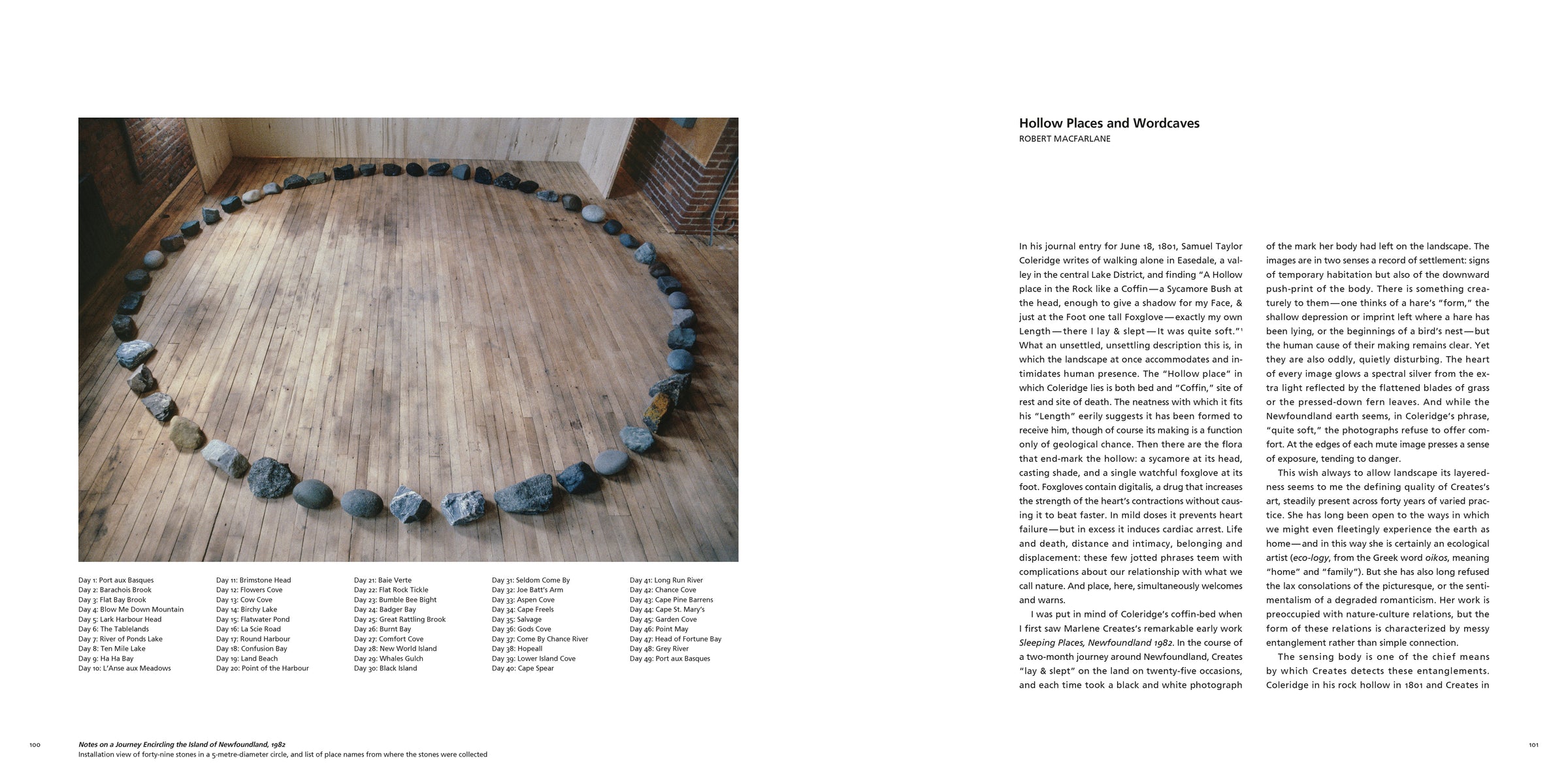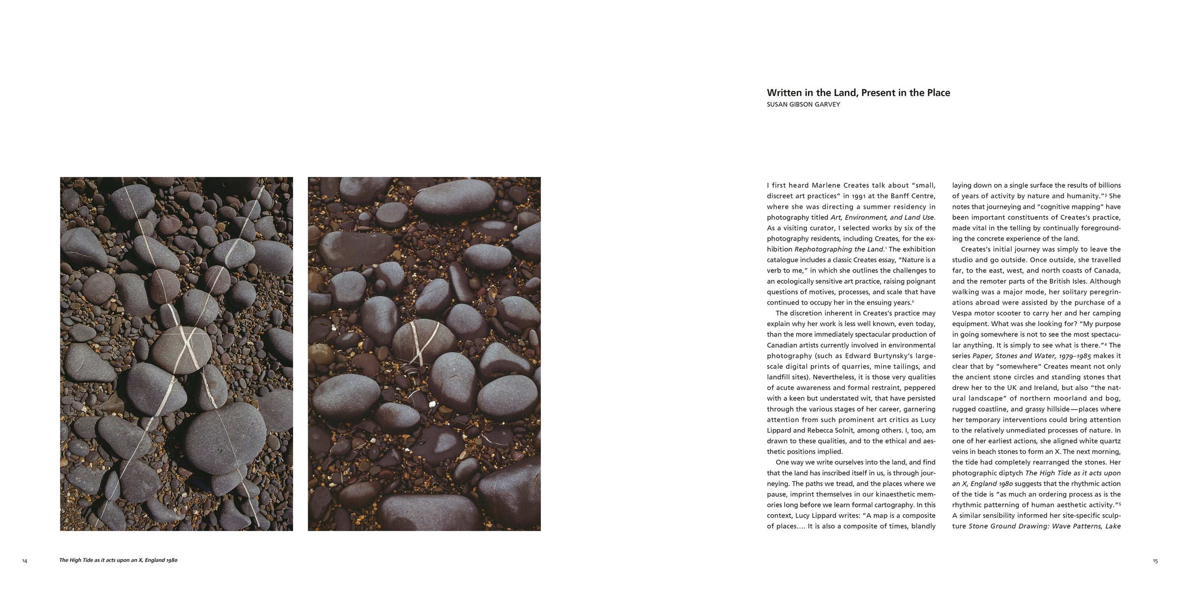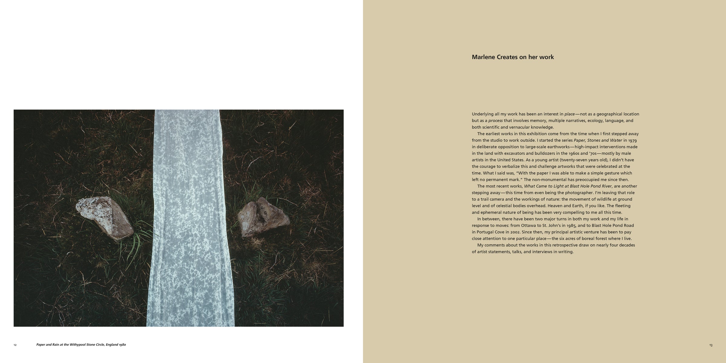 In 1979 Marlene Creates signaled her intent. In contrast to the monumental earthworks of that time, she revealed that her interest in the intersection of art and the natural world was with the ephemeral, the small scale, and the non-monumental, and with place, "not as a geographical location," she writes, "but as a process that involves memory, multiple narratives, ecology, language, and both scientific and vernacular knowledge." Supplementing the impermanence of her artistic gestures with the technology of photography, Creates found an audience and created a body of work without peer.