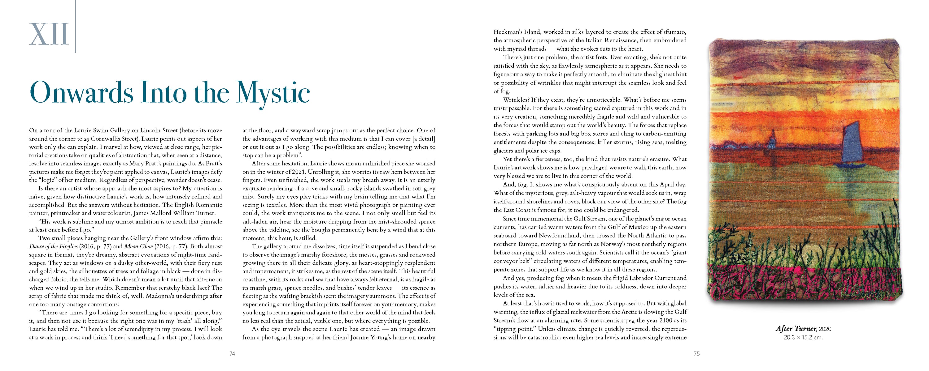 Laurie Swim has worked as an artist for forty years, developing unique and innovative treatments to fashion her imagery in textiles with fabric and thread. She is the author of five books, including The Joy of Quilting (with an introduction by Alex Colville), Quilting, Rags to Riches: The Quilt as Art (with an introduction by Mary Pratt), and a children’s book entitled Hope and Survival on the Halifax Explosion.
