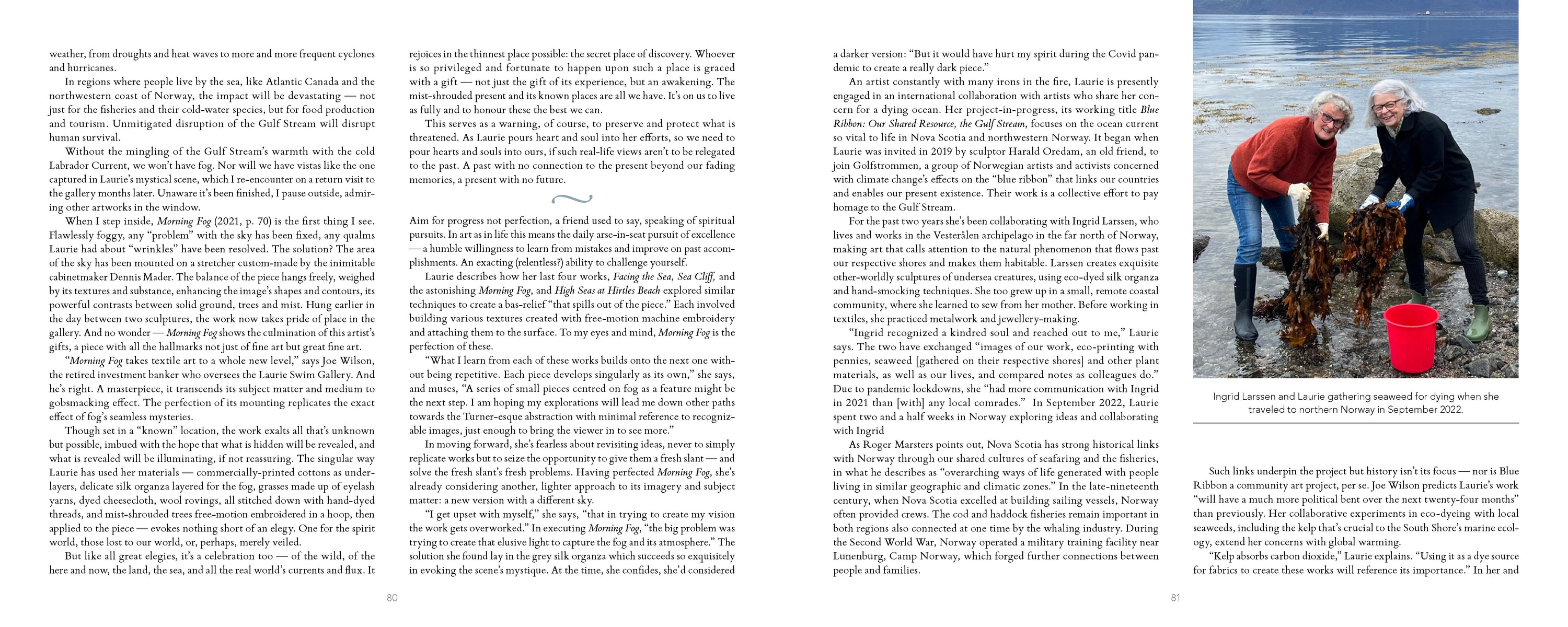 In her chosen art form, Swim captures the essence of the seacoast. For the ocean, she works with silk, pulling stitches until they pucker to create gentle ripples. For vegetation and seaweed, she combines quilting, embroidery, painting, dyeing, and other seemingly opposing techniques.