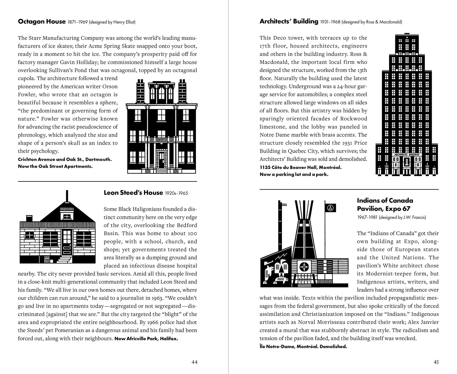 Accompanying Biesinger’s illustrations are Alex Bozikovic’s descriptions which capture each building’s historical, cultural, and architectural significance. Bozikovic draws on local histories, archived building permits and his own extensive knowledge of the Canadian urban architectural landscape and its history — from the letters passed through Kelowna’s unlikely art deco post office to the destruction of a home in Halifax’s Africville — to offer fascinating, sometimes forgotten stories about each building and its significance.