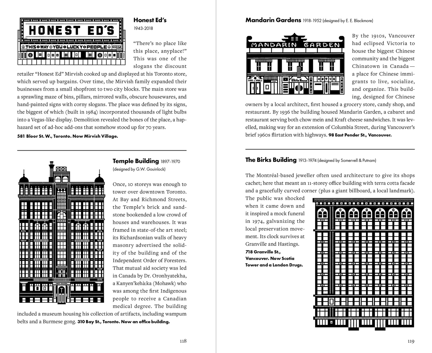 “An X-ray tour of the bolder, more adventurous urban landmarks that once populated Canada's streetscapes. They’re all gone, but Raymond Biesinger's brilliantly stylized drawings and Alex Bozikovic's deeply informed texts turn this into a lively wake for the stylish architectural ghosts that lurk along our sidewalks.” — Doug Saunders, author of Maximum Canada