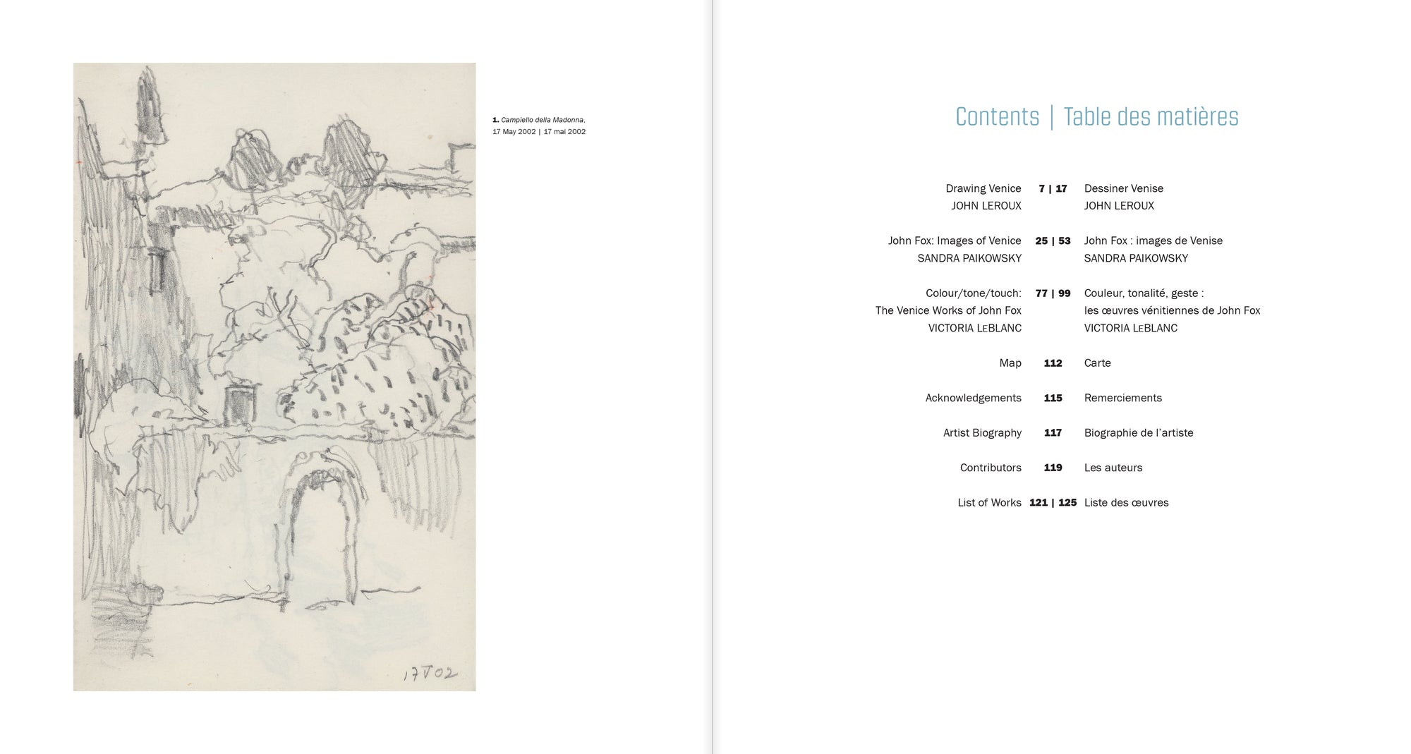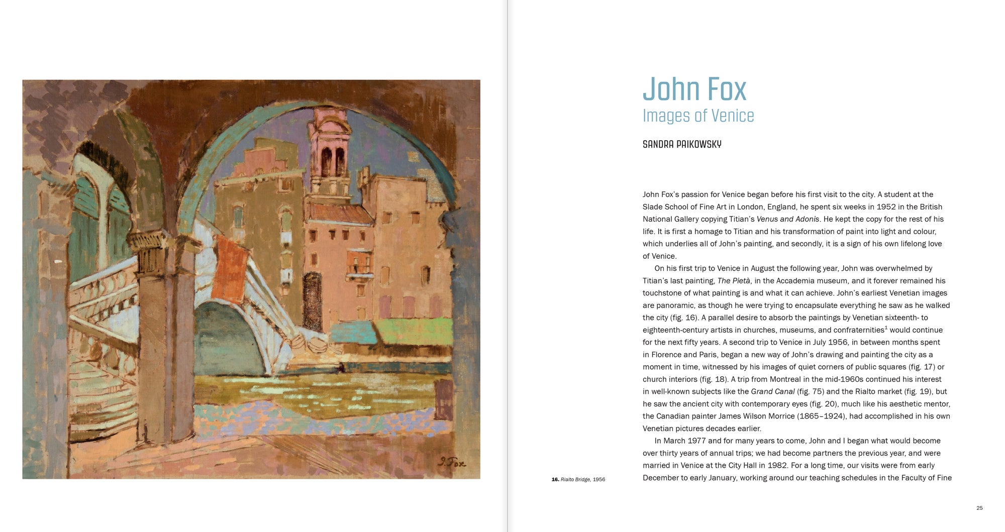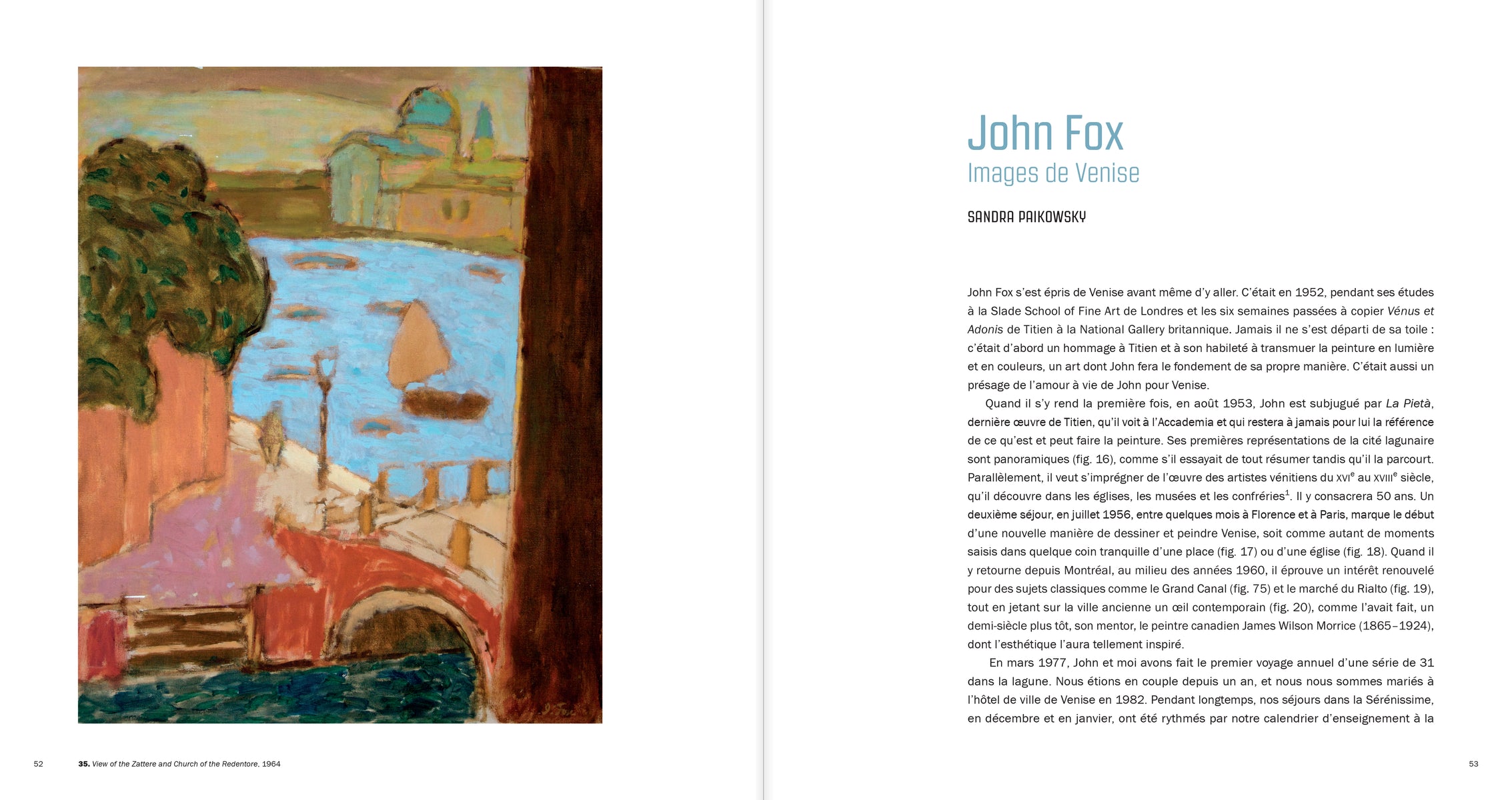 John Fox: Un peintre à Venise regroupe plus de 80 reproductions de peintures, dessins et aquarelles exécutés à Venise, et trois essais de Victoria Leblanc, John Leroux et Sandra Paikowsky, qui sondent la remarquable carrière de cet artiste, ainsi que sa présence dans sa ville de prédilection, son profond attachement pour l’authenticité des quartiers moins connus et son exploration très personnelle de l’art et de l’architecture vénitiens.