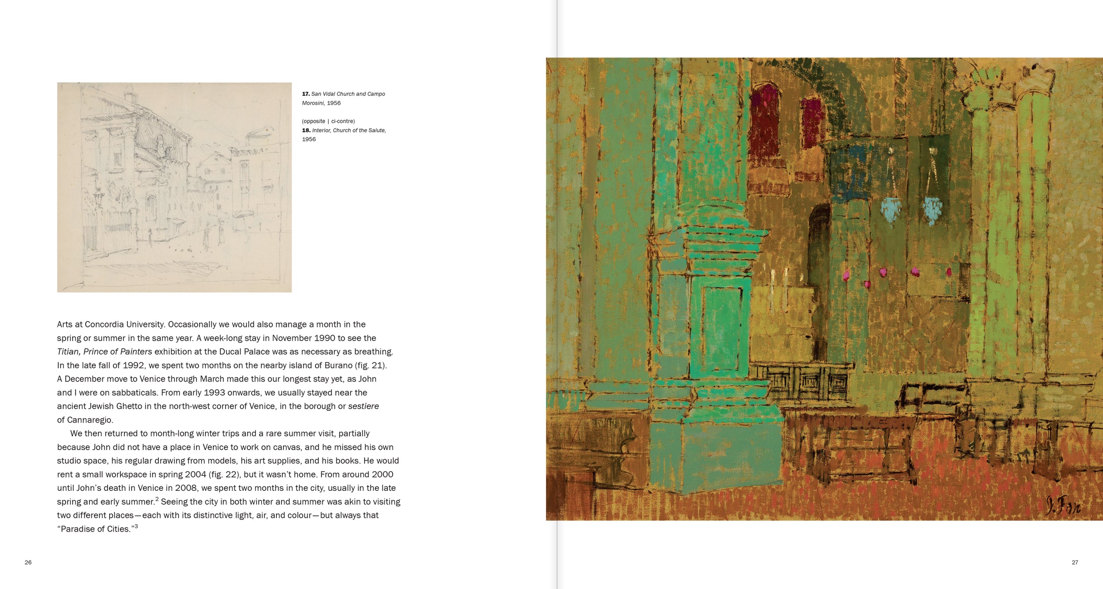 John Fox: A Painter in Venice | Un peintre à Venise features over 75 reproductions of his Venetian paintings, drawings, and watercolours, and three essays about Fox’s remarkable career by Victoria LeBlanc, John Leroux, and Sandra Paikowsky that explore his time in the city, his devotion to the authenticity of Venice’s lesser-known neighbourhoods, and his very personal exploration of Venetian art and architecture.