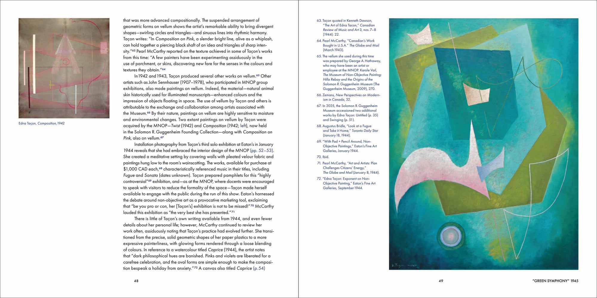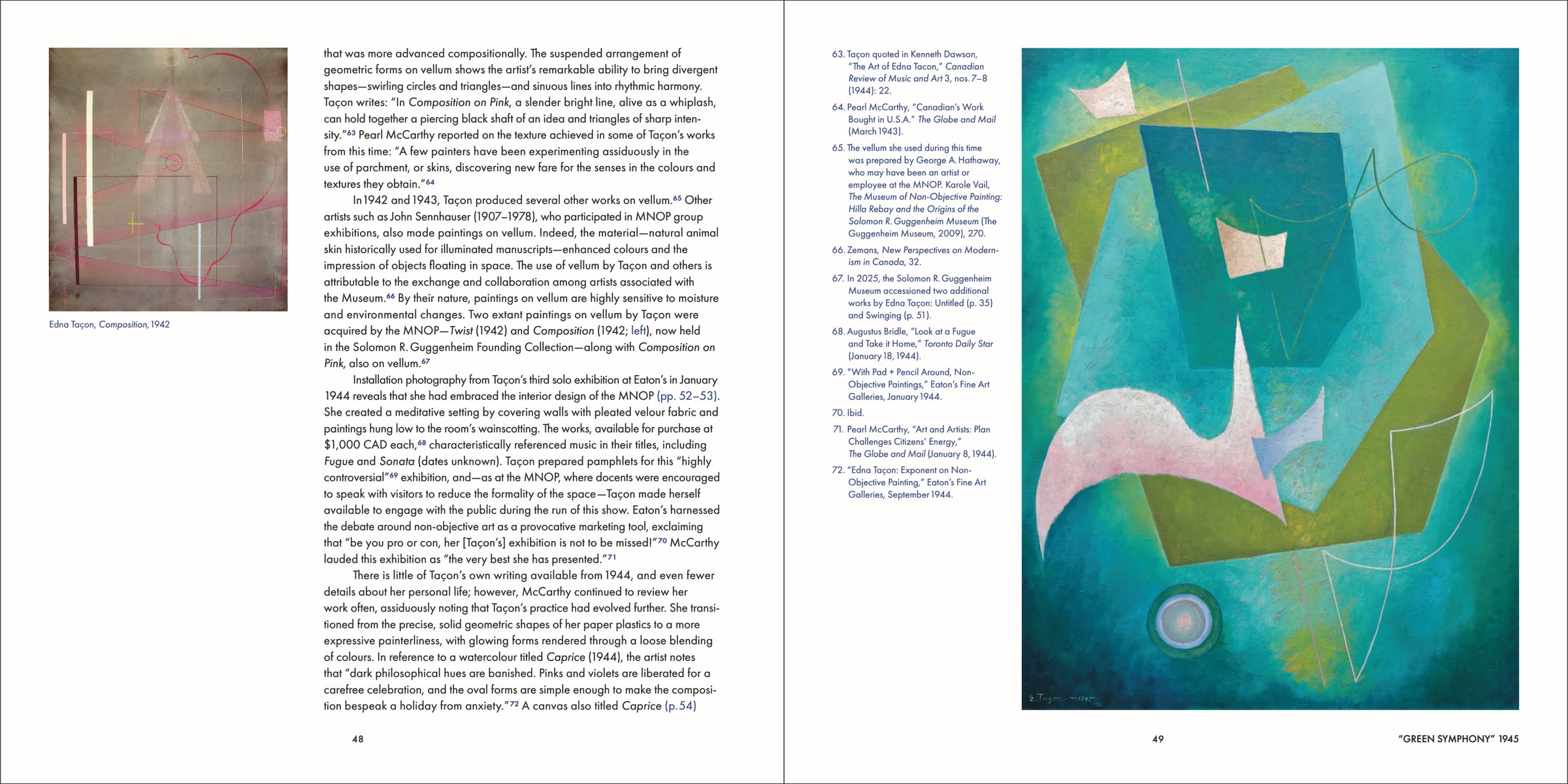 Edna Taçon became a prominent figure in Toronto during the 1940s, where she had a crucial impact on the development of abstract painting. Described as “Canada’s leading proponent of non-objective art,” she split her time between Toronto and New York, maintaining a practice that was in step with leading avant-garde artists.