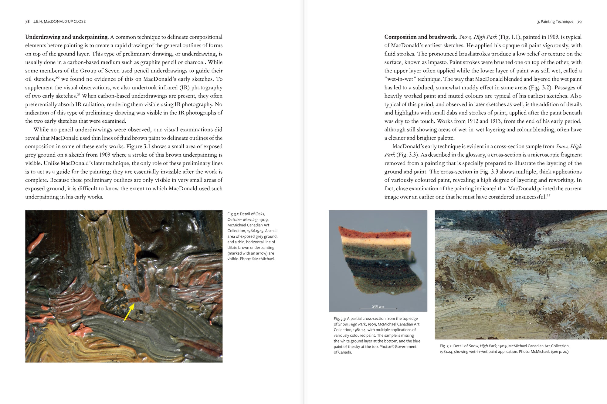 Helwig and Douglas’s fascinating text is accompanied not only by reproductions of key artworks, but also by never-before-seen photographs taken through a microscope. These unique, close-up views of MacDonald’s working methods reveal the texture of his brushstrokes and the characteristic ways he layered and mixed his paint.