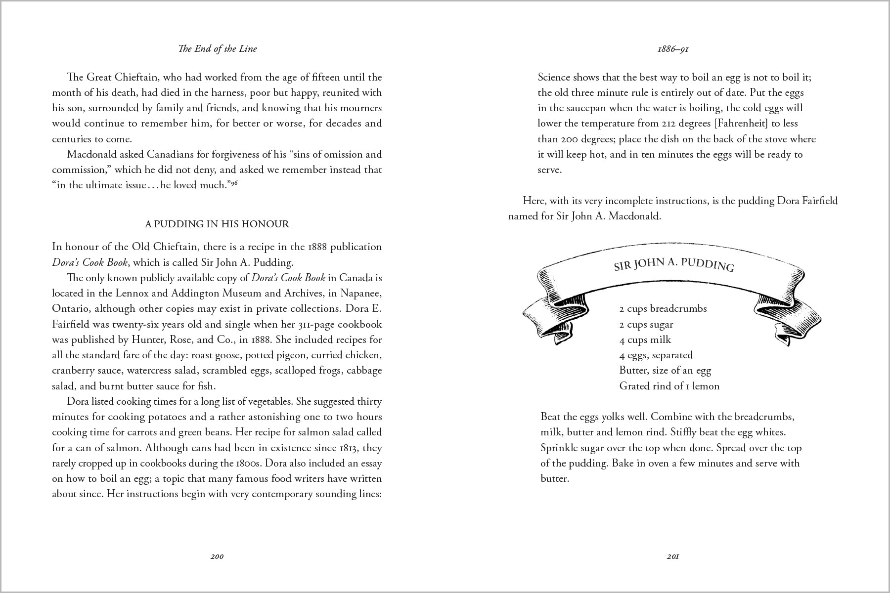 Sir John's Table traverses the colourful life of Macdonald, from his passage as a young Scottish boy in the steerage compartment aboard the Earl of Buckinghamshire to his new home in Kingston, Upper Canada. It traces his boyhood years of stealing fish and scarfing down fairy cakes into his adult life as a lawyer, husband, father, and eventual leader of the newly founded dominion of Canada. It was a journey that began with hardtack and suspicious-looking, watered-down stew amidst appallingly unsanitary conditions and culminated in grand dinners held in Macdonald's honour.