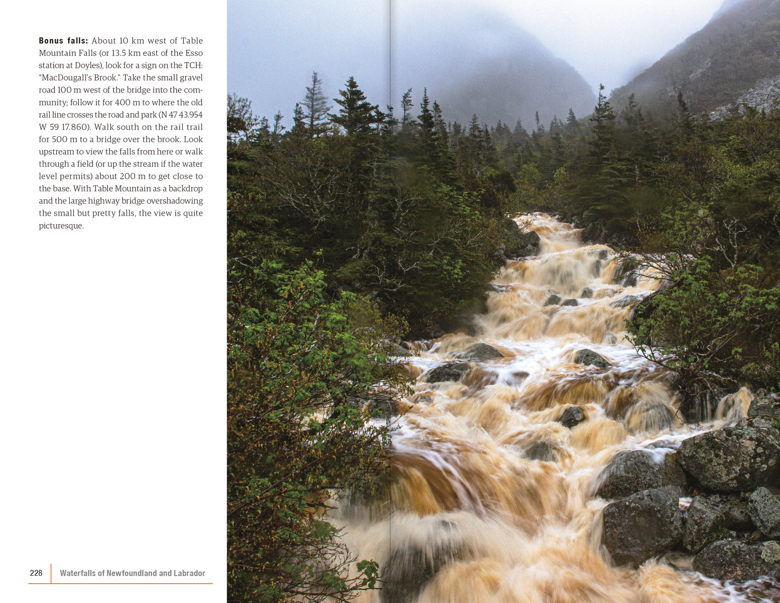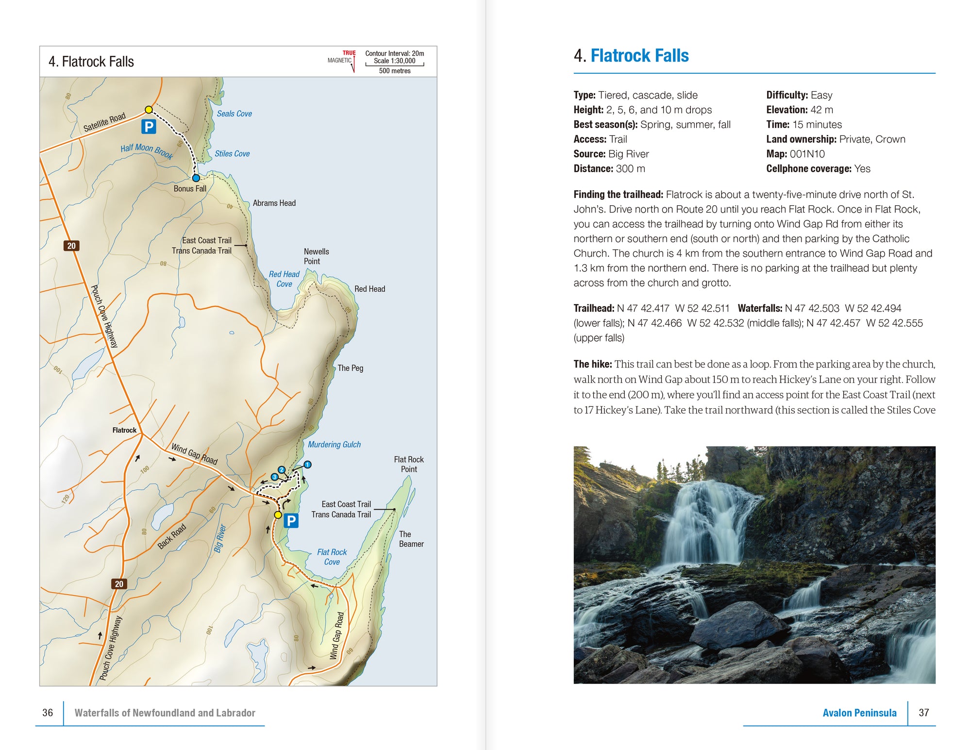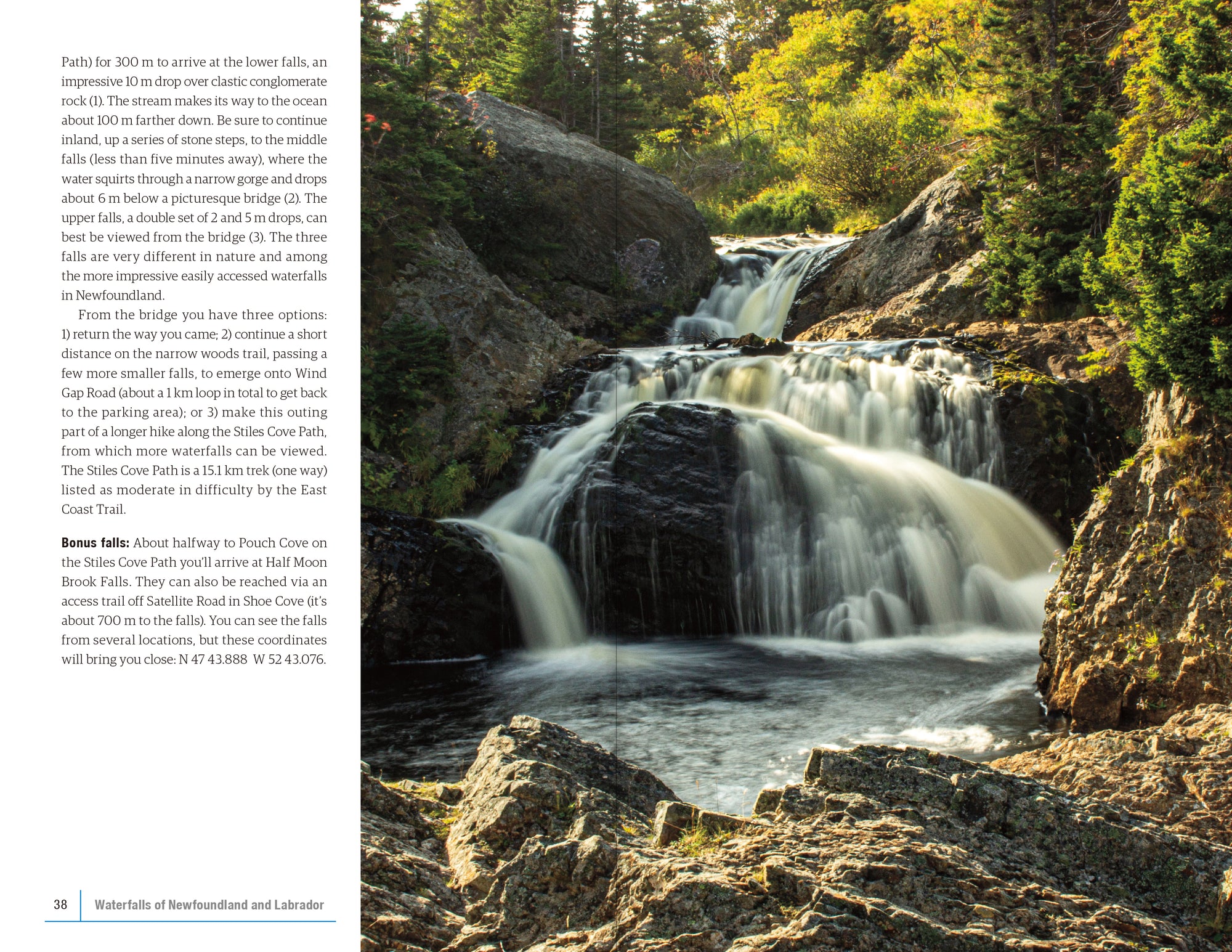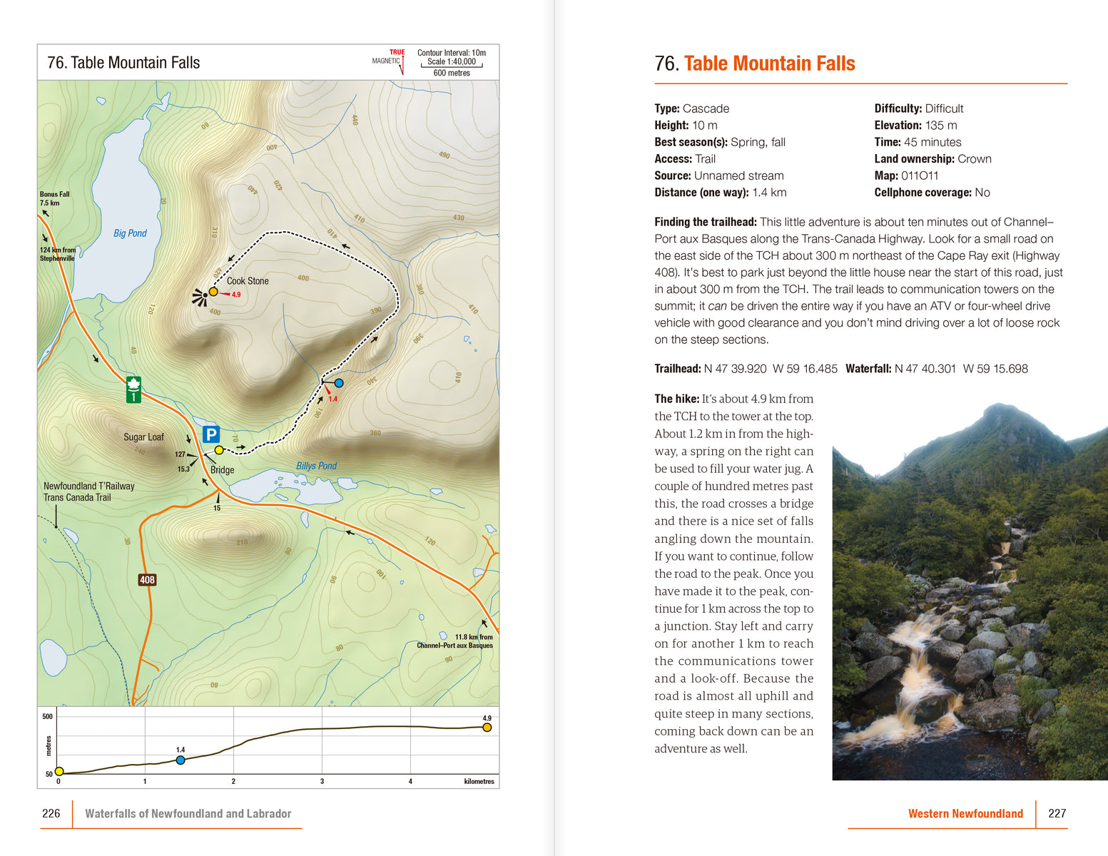The one hundred treasures in Waterfalls of Newfoundland and Labradorare divided into six easy-to-read geographic areas: Avalon Peninsula, Burin and Bonavista Peninsulas, Central Newfoundland, Western Newfoundland, Great Northern Peninsula, and Labrador. Along with the name and type of waterfall, each entry includes useful information about access points; difficulty and distance of the hike from the trailhead; land ownership; the best seasons to visit; and the source, height, and elevation of the fall itself.